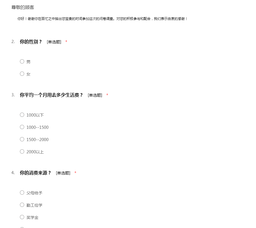 此份问卷是为了调查一下在各大高校学子的消费行为,希望您能认真填写问卷,谢谢您的合作!51调查网(我要调查网)谢谢您的参与。