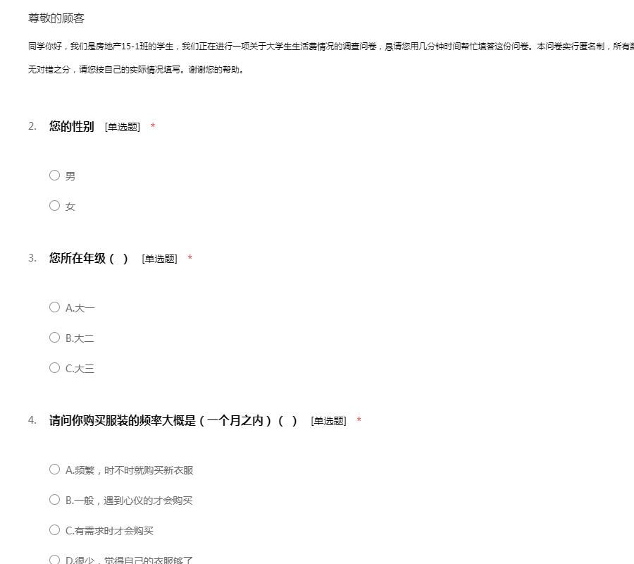 同学你好,我们是房地产15-1班的学生,我们正在进行一项关于大学生生活费情况的调查问卷,恳请您用几分钟时间帮忙填答这份问卷。本问卷实行匿名制,所有数据只用于统计分析, 请您放心填写。题目选项无对错之分,请您按自己的实际情况填写。谢谢您的帮助。