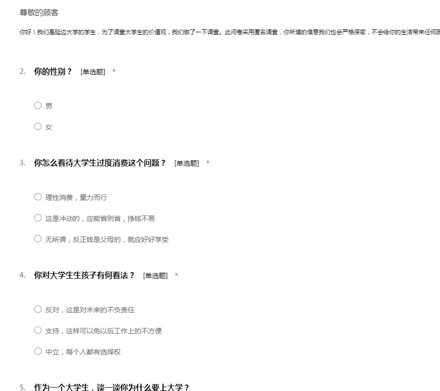 你好!我们是延边大学的学生,为了调查大学生的价值观,我们做了一下调查。此问卷采用匿名调查,你所填的信息我们也会严格保密,不会给你的生活带来任何困扰,谢谢你的合作!