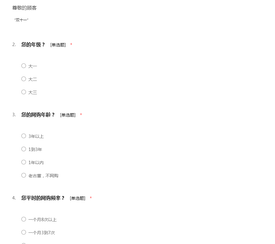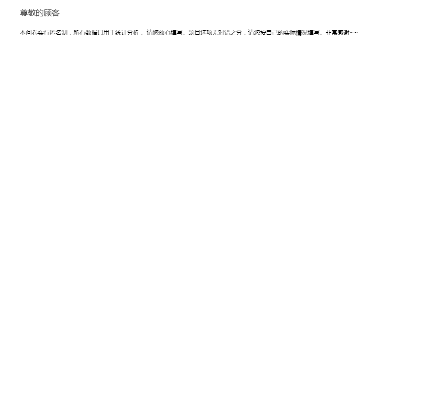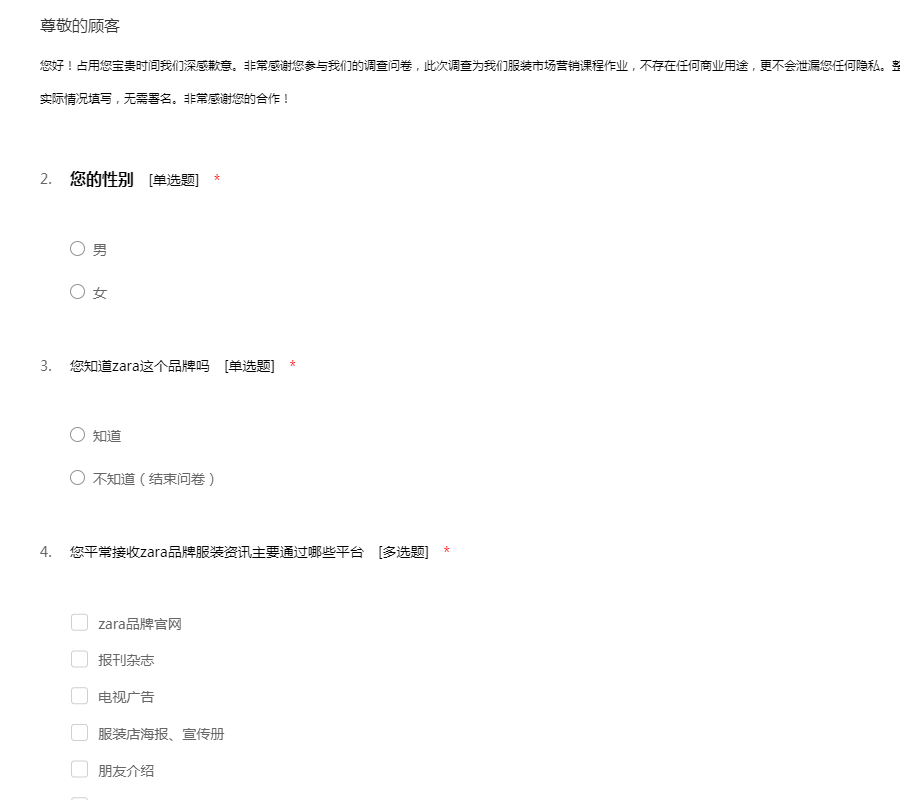 您好!占用您宝贵时间我们深感歉意。非常感谢您参与我们的调查问卷,此次调查为我们服装市场营销课程作业,不存在任何商业用途,更不会泄漏您任何隐私。整个问卷中涉及的题目没用对错之分,请根据您的实际情况填写,无需署名。非常感谢您的合作!
