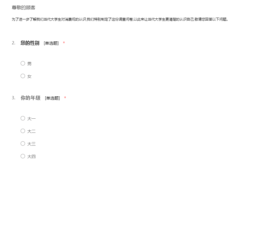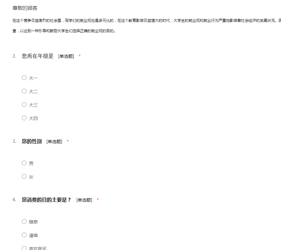 此份问卷是为了调查一下在大学生的消费观,希望您能认真填写问卷,谢谢您的合作!51调查网(我要调查网)谢谢您的参与。