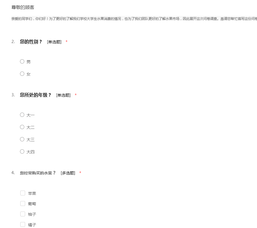 亲爱的同学们,你们好!为了更好的了解我们学校大学生水果消费的情况,也为了我们团队更好的了解水果市场,因此展开这次问卷调查。恳请您帮忙填写这份问卷。此问卷采用匿名方式,感谢您的配合!