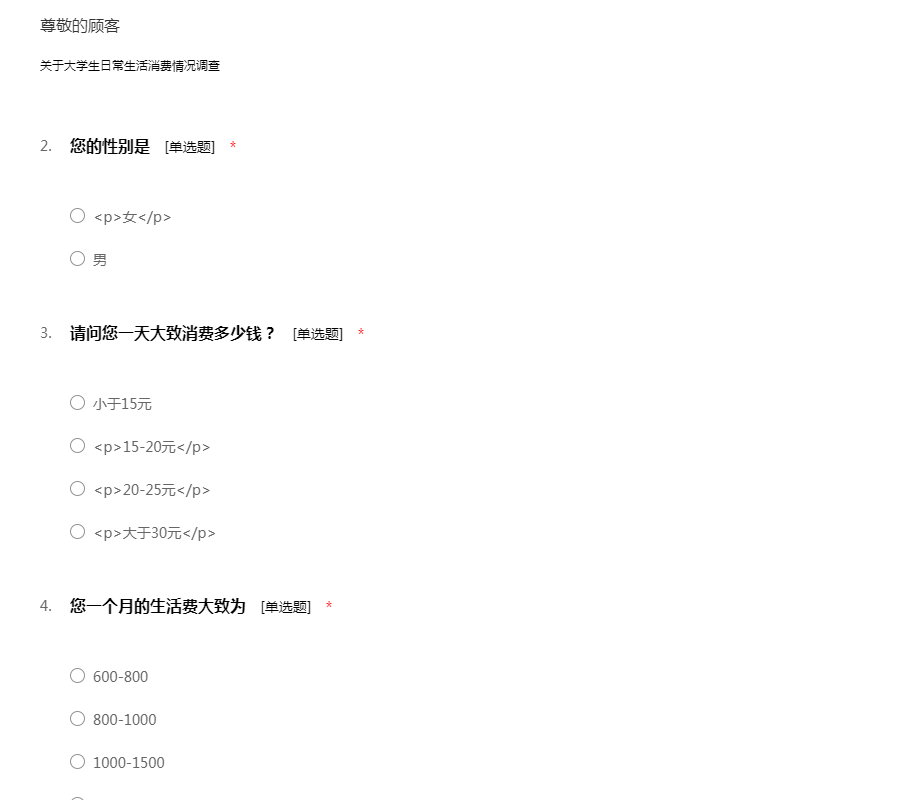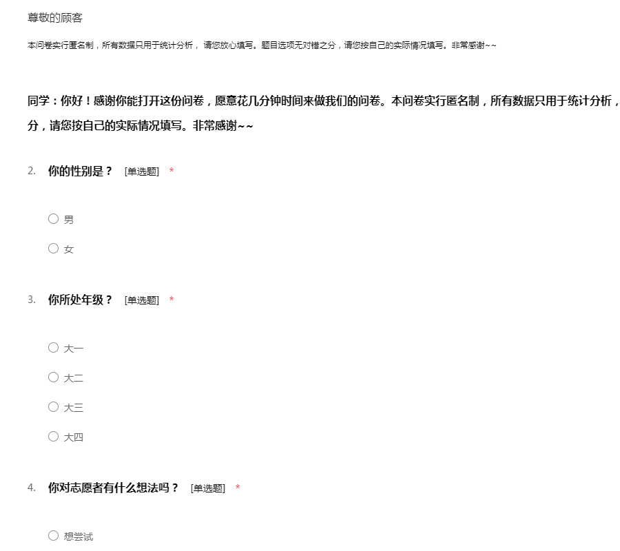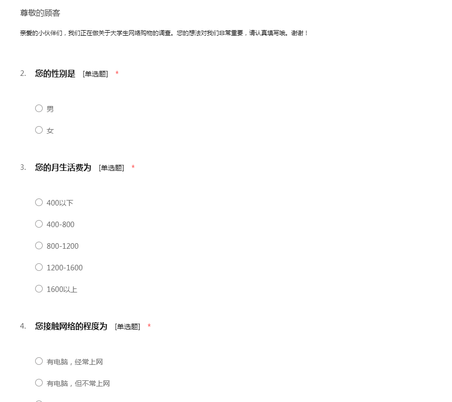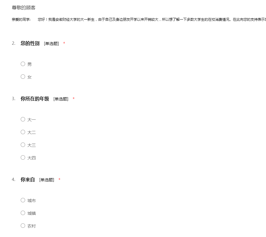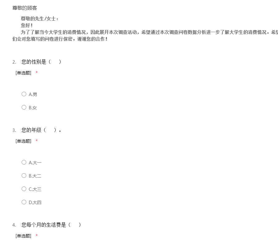 尊敬的先生/女士:您好!为了了解当今大学生的消费情况,因此展开本次调查活动,希望通过本次调查问卷数据分析进一步了解大学生的消费情况。希望您根据平时的消费情况如实填写,我们会对您填写的问卷进行保密。谢谢您的合作!