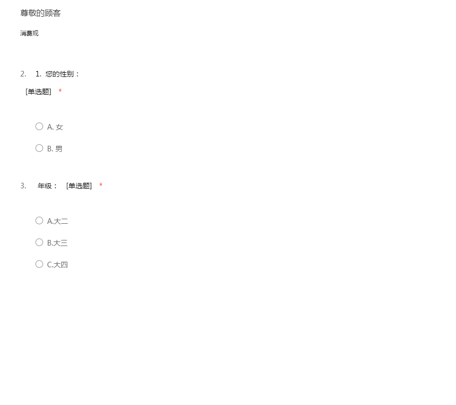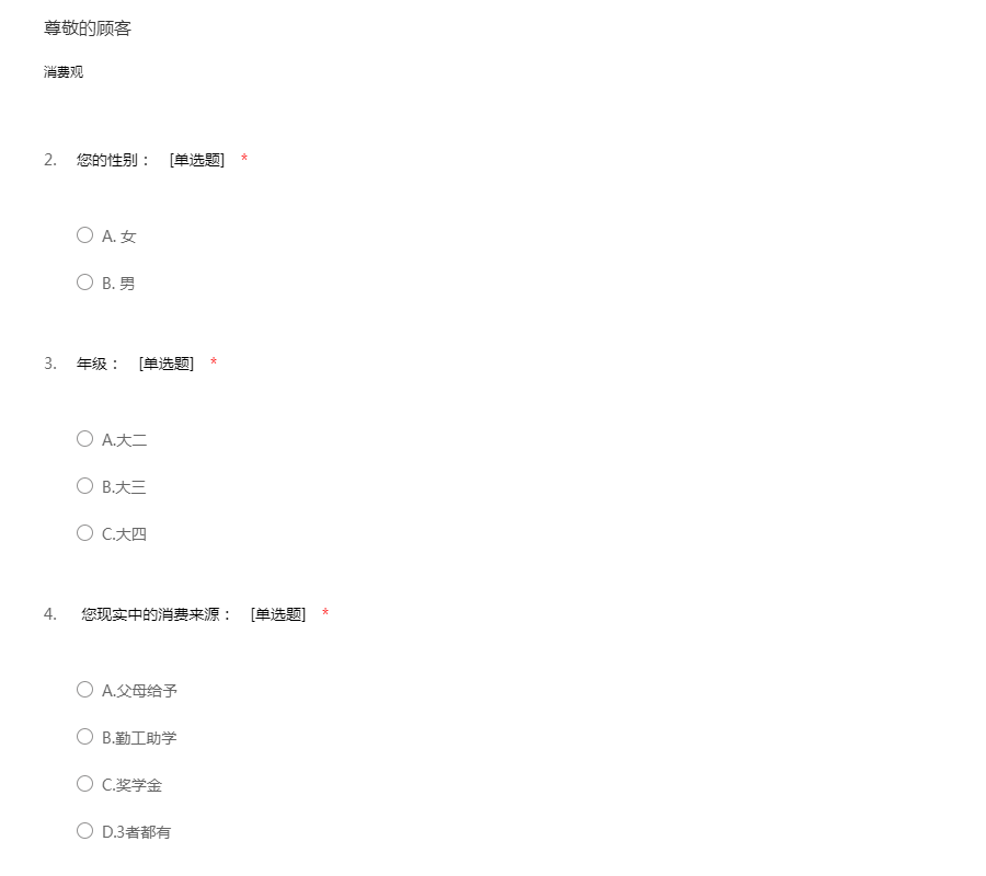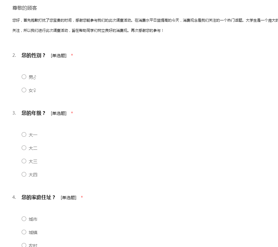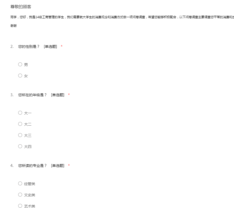 同学,您好,我是14级工商管理的学生,我们需要就大学生的消费观念和消费方式做一项问卷调查,希望您能够积极配合,以下问卷调查主要调查您平常的消费和生活费用上的问题,不会涉及到您的个人隐私。谢谢