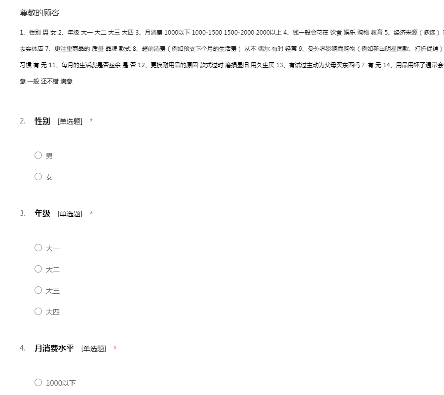 1、性别 男 女 2、年级 大一 大二 大三 大四 3、月消费 1000以下 1000-1500 1500-2000 2000以上 4、钱一般会花在 饮食 娱乐 购物 教育 5、经济来源(多选) 家庭 勤工兼职 奖学金 贷款 6、平时购物会 网购 去实体店 7、更注重商品的 质量 品牌 款式 8、超前消费(例如预支下个月的生活费) 从不 偶尔 有时 经常 9、受外界影响而购物(例如新出明星同款、打折促销) 从不 偶尔 有时 经常 10、有无消费计划与做账习惯 有 无 11、每月的生活费是否盈余 是 否 12、更换耐用品的原因 款式过时 磨损显旧 用久生厌 13、有试过主动为父母买东西吗? 有 无 14、用品用坏了通常会 买新的 维修 15、对当前消费状况满意程度 不满意 一般 还不错 满意