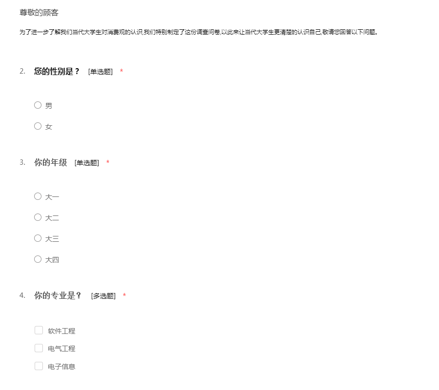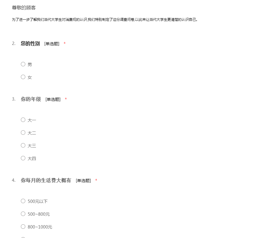 为了进一步了解我们当代大学生对消费观的认识,我们特别制定了这份调查问卷,以此来让当代大学生更清楚的认识自己。