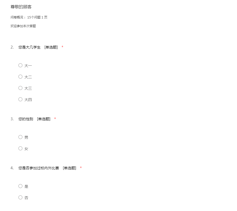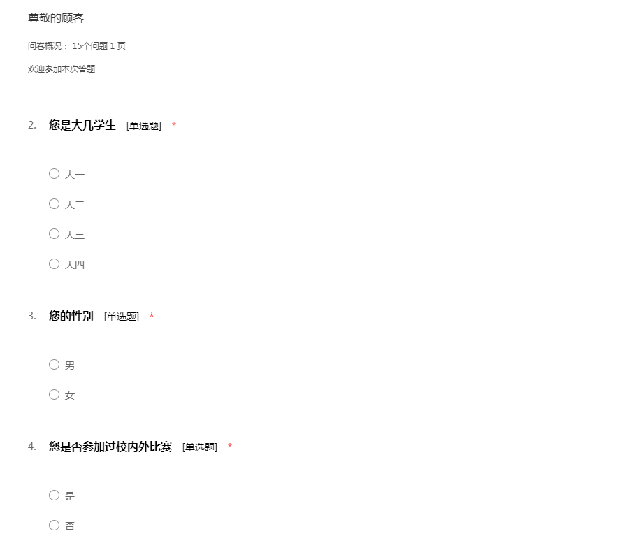 问卷概况: 15个问题 1 页欢迎参加本次答题