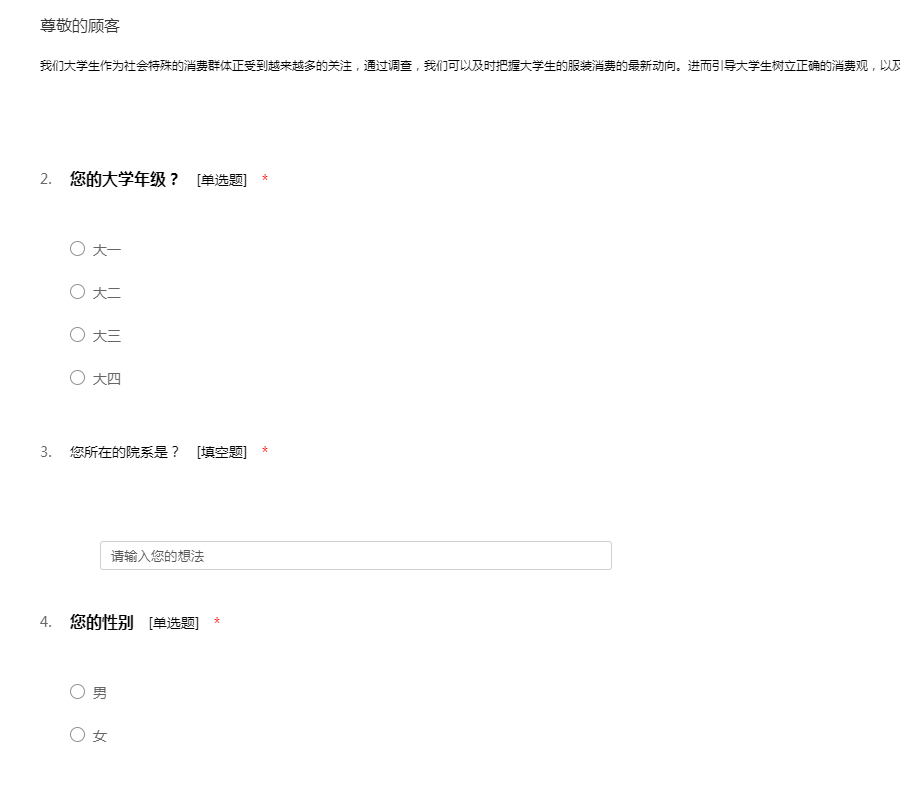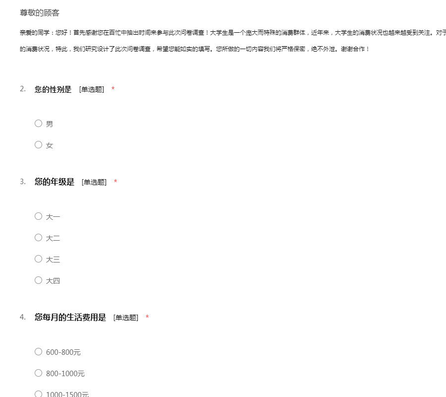 亲爱的同学:您好!首先感谢您在百忙中抽出时间来参与此次问卷调查!大学生是一个庞大而特殊的消费群体,近年来,大学生的消费状况也越来越受到关注。对于大学生的消费状况研究有利于研究整个中国社会的消费状况,特此,我们研究设计了此次问卷调查,希望您能如实的填写。您所做的一切内容我们将严格保密,绝不外泄。谢谢合作!