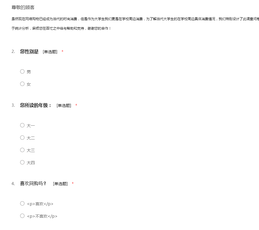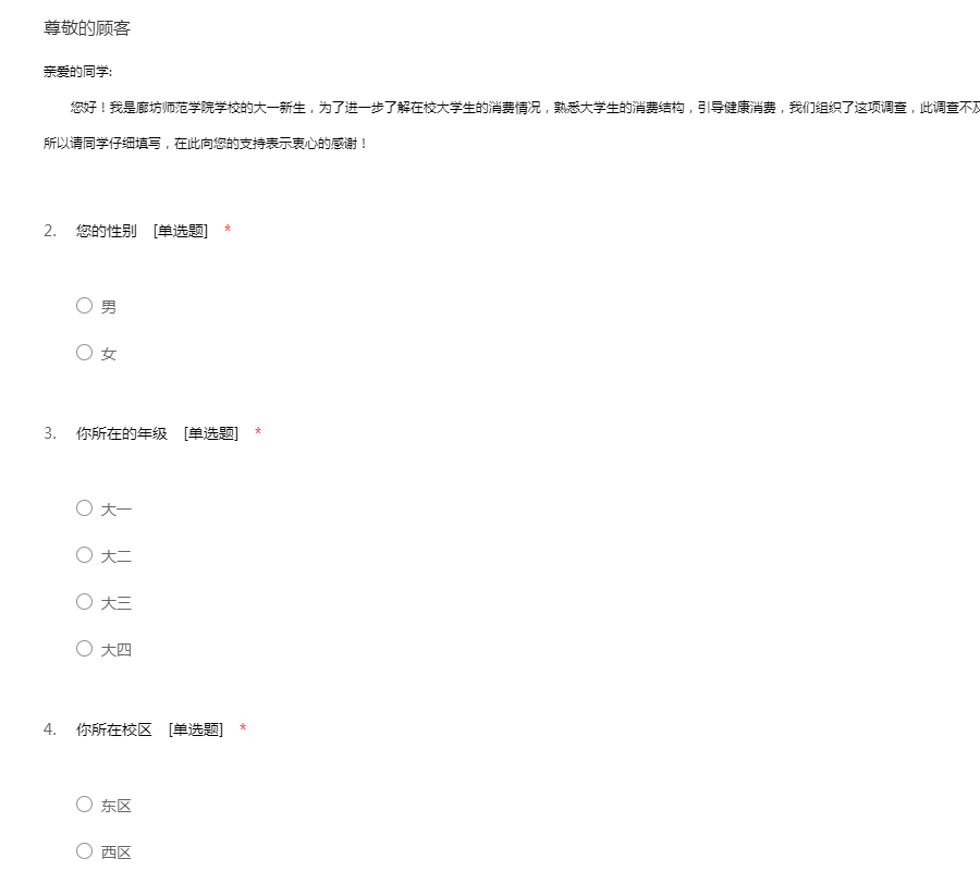 亲爱的同学: 您好!我是廊坊师范学院学校的大一新生,为了进一步了解在校大学生的消费情况,熟悉大学生的消费结构,引导健康消费,我们组织了这项调查,此调查不及姓名,提供的有关资料仅供作业研究绝不公开。所以请同学仔细填写,在此向您的支持表示衷心的感谢!
