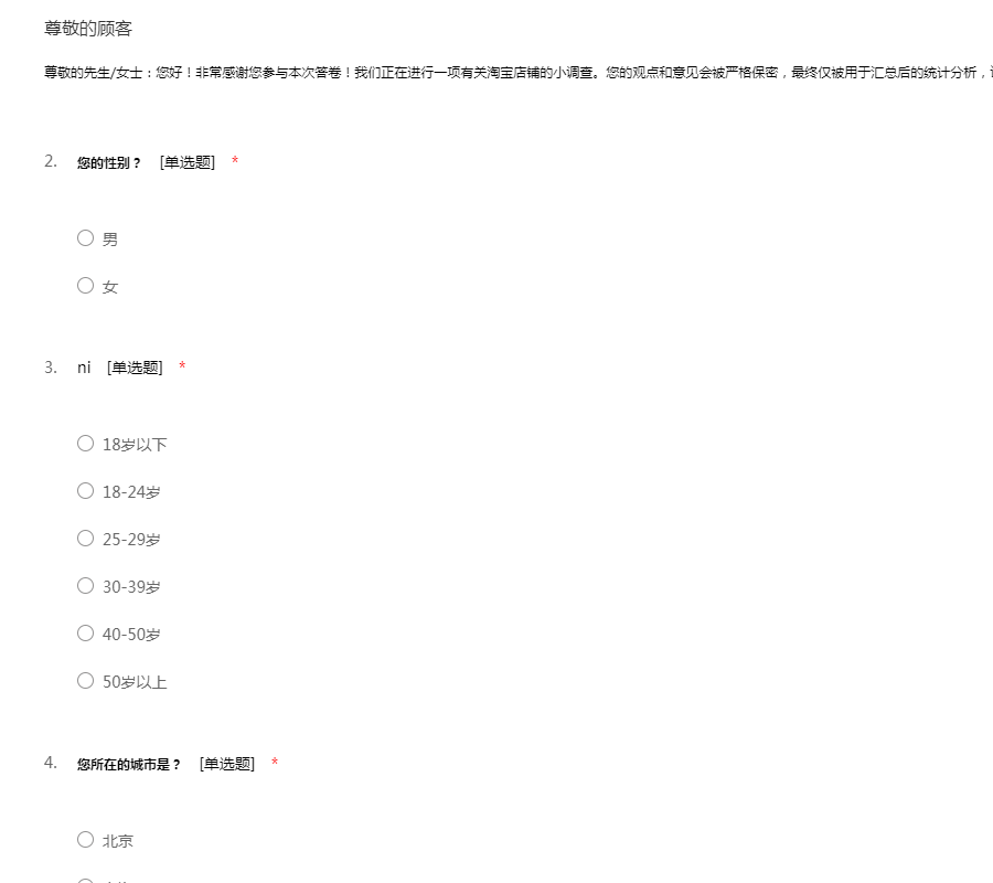 尊敬的先生/女士:您好!非常感谢您参与本次答卷!我们正在进行一项有关淘宝店铺的小调查。您的观点和意见会被严格保密,最终仅被用于汇总后的统计分析,请您放心填写。