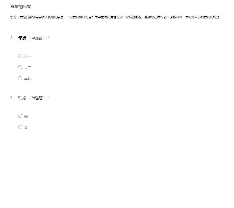 您好!我是安徽水电学院人资班的学生。本次我们将针对全校大学生月消费情况做一次调查问卷,感谢您在百忙之中能够抽出一点时间来参加我们的调查!