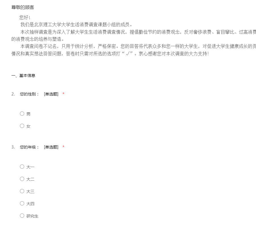您好! 我们是北京理工大学大学生活消费调查课题小组的成员。 本次抽样调查是为深入了解大学生生活消费调查情况,提倡勤俭节约的消费观念,反对奢侈浪费、盲目攀比、过高消费等不良消费风气,加强大学生健康的消费观念的培养与塑造。 本调查问卷不记名,只用于统计分析,严格保密。您的回答将代表众多和您一样的大学生,对促进大学生健康成长的贡献一份力量。请您按照自己的实际情况和真实想法回答问题,答卷时只需对所选的选项打“√”。衷心感谢您对本次调查的大力支持!
