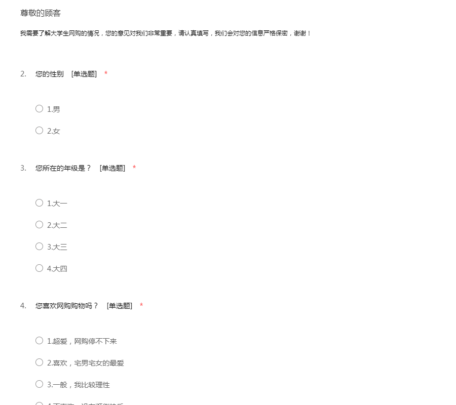 我需要了解大学生网购的情况,您的意见对我们非常重要,请认真填写,我们会对您的信息严格保密,谢谢!