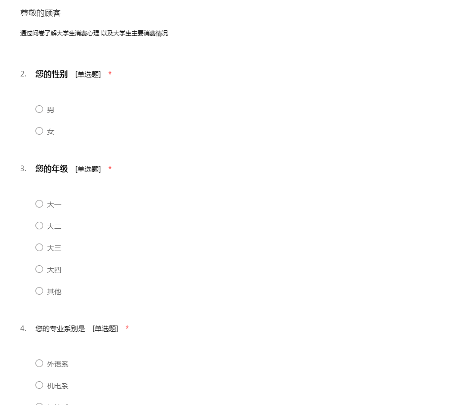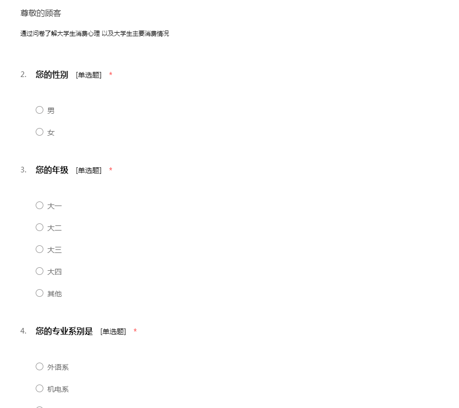 此问卷旨在了解大学生的消费观和消费状况。恳请你抽出几分钟时间参与我们的调查,我们将为你的信息保命,并十分感谢你的支持!