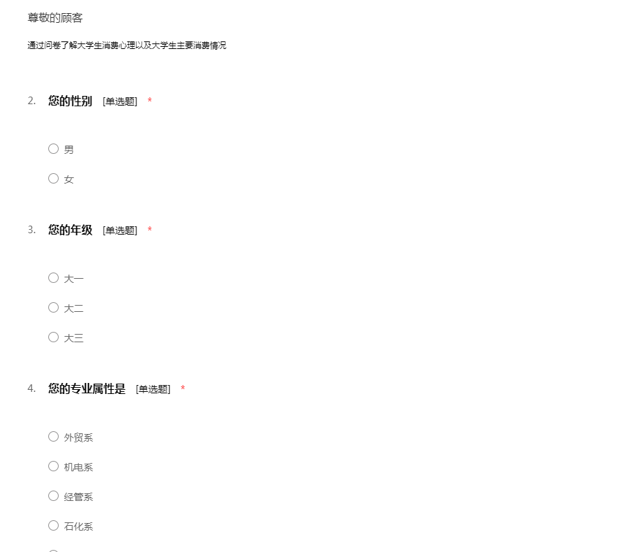 此份问卷是为了调查一下在大学生的消费观,希望您能认真填写问卷,谢谢您的合作!51调查网(我要调查网)谢谢您的参与。