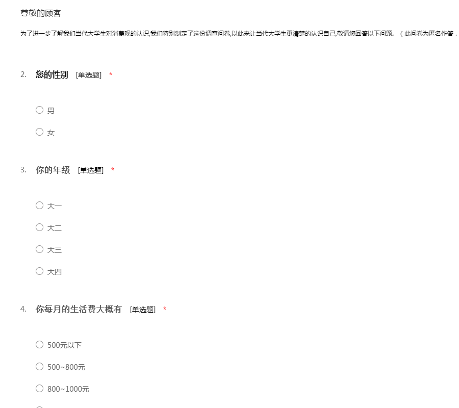为了进一步了解我们当代大学生对消费观的认识,我们特别制定了这份调查问卷,以此来让当代大学生更清楚的认识自己,敬请您回答以下问题。(此问卷为匿名作答,不会透露您的个人隐私)