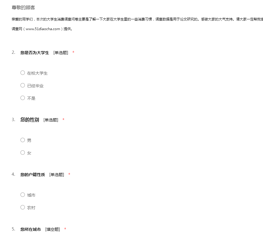 此份问卷是为了调查一下在各大高校学子的消费行为,希望您能认真填写问卷,谢谢您的合作!51调查网(我要调查网)谢谢您的参与。