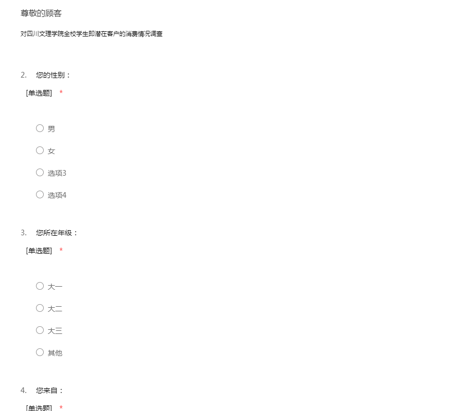 大学生作为一个特殊的消费群体得到越来越多的关注,为了进一步了解在校大学生的消费心理,熟悉大学生的消费结构,最终引导健康消费,特开展此次调查,您的意见对我们非常重要,请认真填写,谢谢!