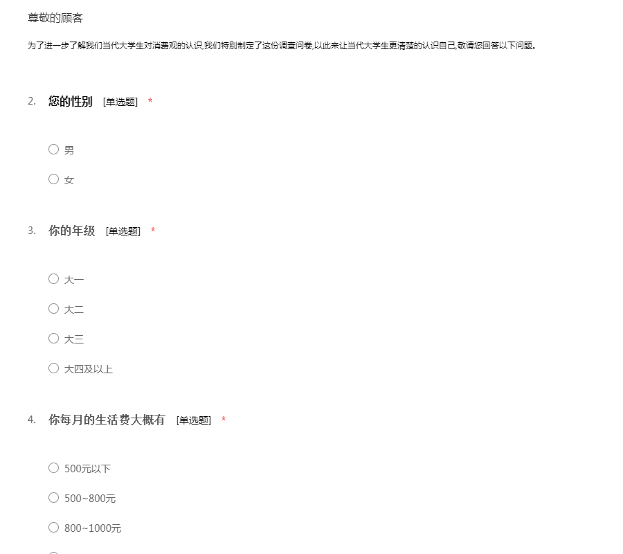 为了进一步了解我们当代大学生对消费观的认识,我们特别制定了这份调查问卷,以此来让当代大学生更清楚的认识自己,敬请您回答以下问题。