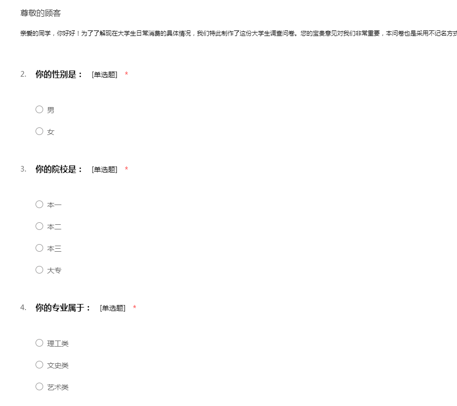 亲爱的同学,你好好!为了了解现在大学生日常消费的具体情况,我们特此制作了这份大学生调查问卷。您的宝贵意见对我们非常重要,本问卷也是采用不记名方式,所以请放心的如实填写。感谢您的配合!