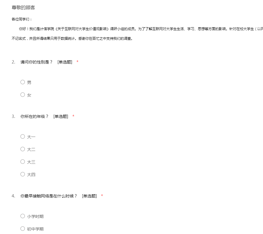 各位同学们: 你好!我们是计信学院《关于互联网对大学生价值观影响》调研小组的成员。为了了解互联网对大学生生活、学习、思想等方面的影响。针对在校大学生(以网络形式发放)特别进行此次调查,本次调查采用不记名式,并且所得结果只用于数据统计。感谢你在百忙之中支持我们的调查。