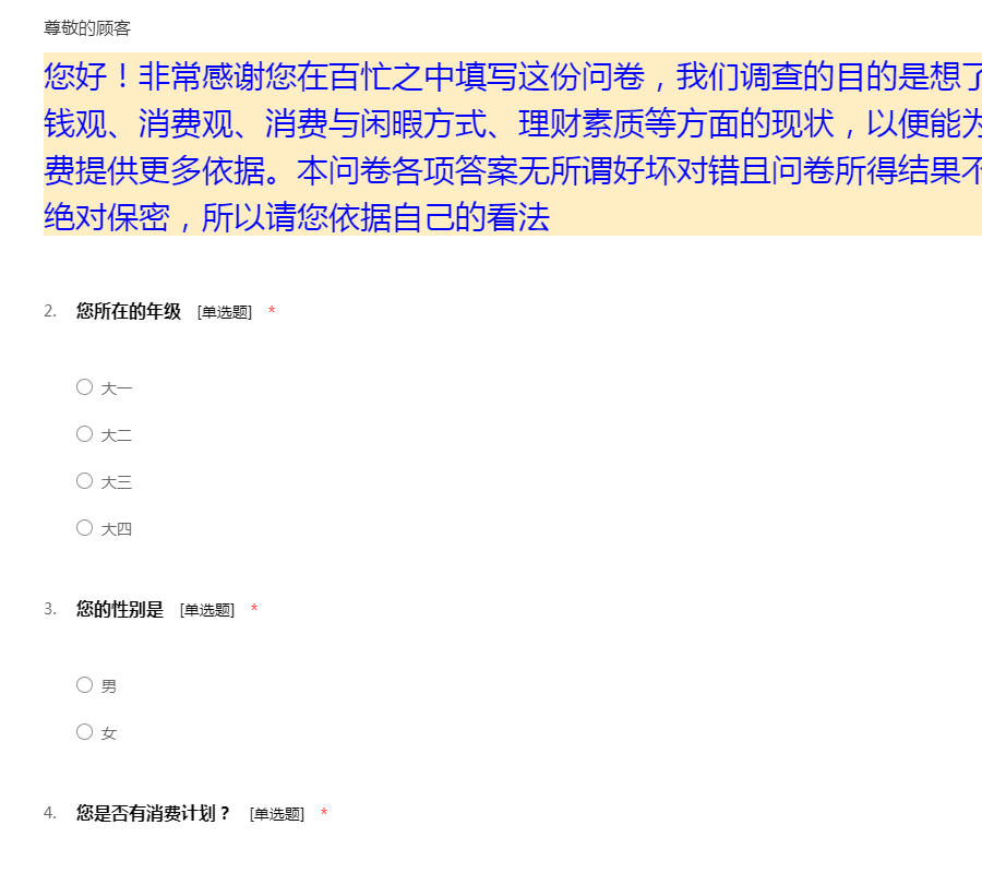 您好!非常感谢您在百忙之中填写这份问卷,我们调查的目的是想了解目前大学生在金钱观、消费观、消费与闲暇方式、理财素质等方面的现状,以便能为研究大学生时尚消费提供更多依据。本问卷各项答案无所谓好坏对错且问卷所得结果不做个别呈现,对外绝对保密,所以请您依据自己的看法