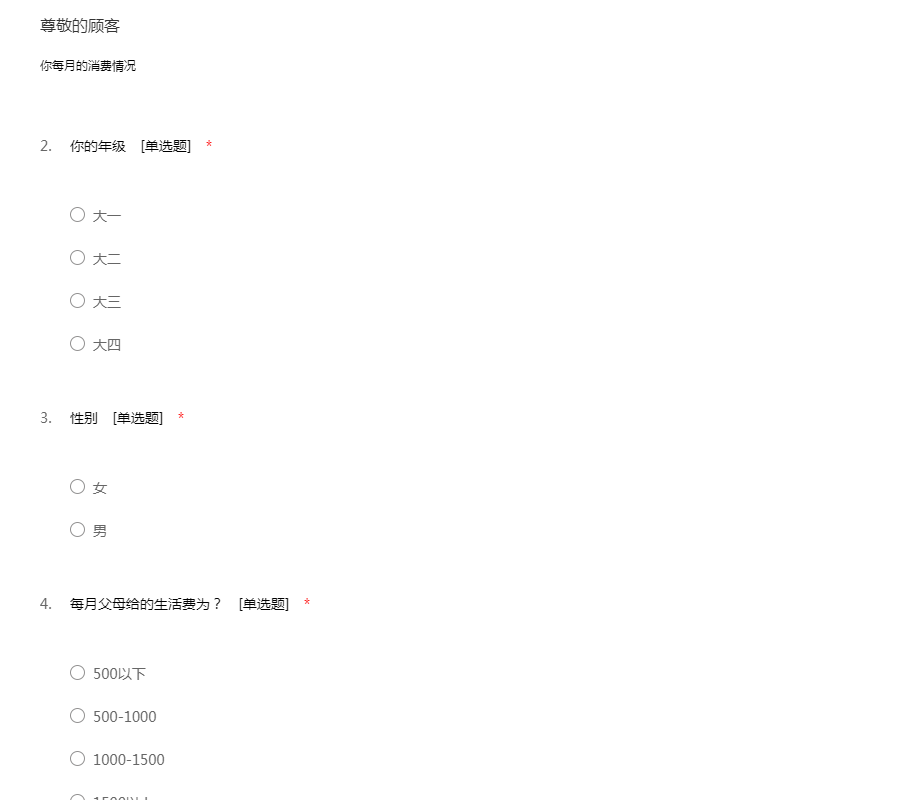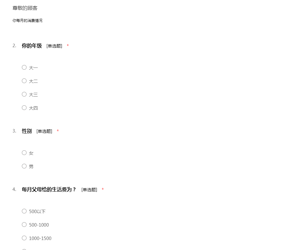 为了进一步了解我们当代大学生对消费观的认识,我们特别制定了这份调查问卷,以此来让当代大学生更清楚的认识自己,敬请您回答以下问题。