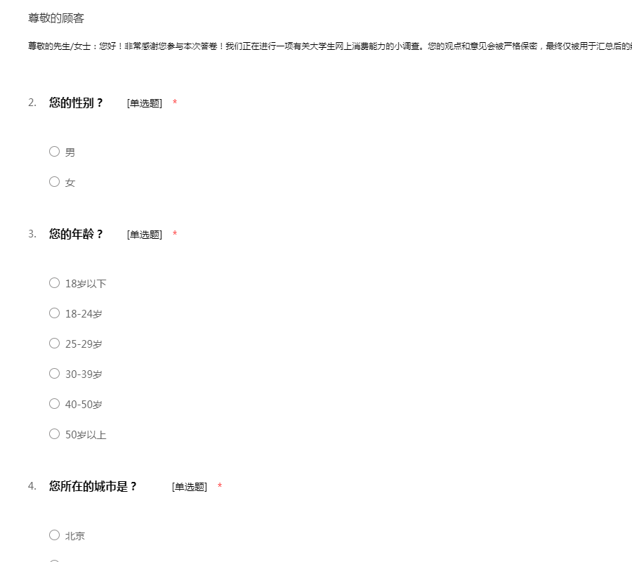尊敬的先生/女士:您好!非常感谢您参与本次答卷!我们正在进行一项有关大学生网上消费能力的小调查。您的观点和意见会被严格保密,最终仅被用于汇总后的统计分析,请您放心填写。