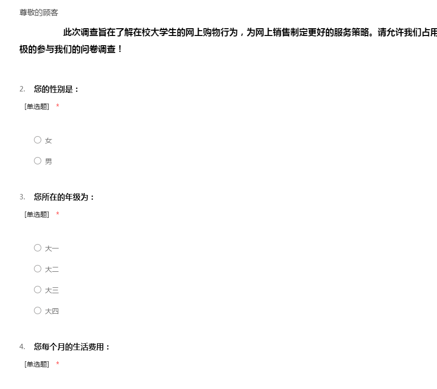 ——亲爱的同学,你好!我们现在正在展开对大学生消费观的小差,需要得到你们的配合。该问卷采用不记名制,所以请同学们放心的如实回答。感谢你的配合!