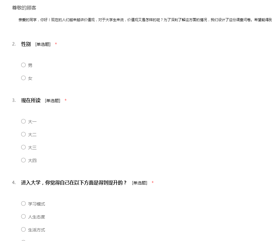 亲爱的同学,你好!现在的人们越来越讲价值观,对于大学生来说,价值观又是怎样的呢?为了深刻了解这方面的情况,我们设计了这份调查问卷。希望能得到你的支持,我们发自中心的感谢!