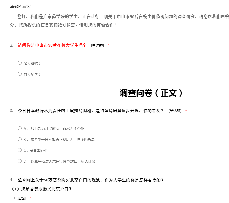 您好,我们是广东药学院的学生,正在进行一项关于中山市90后在校生价值观问题的调查研究,请您帮我们回答一些问题好吗?您的回答无对错之分,您所提供的信息我们绝对保密。谢谢您的真诚合作!