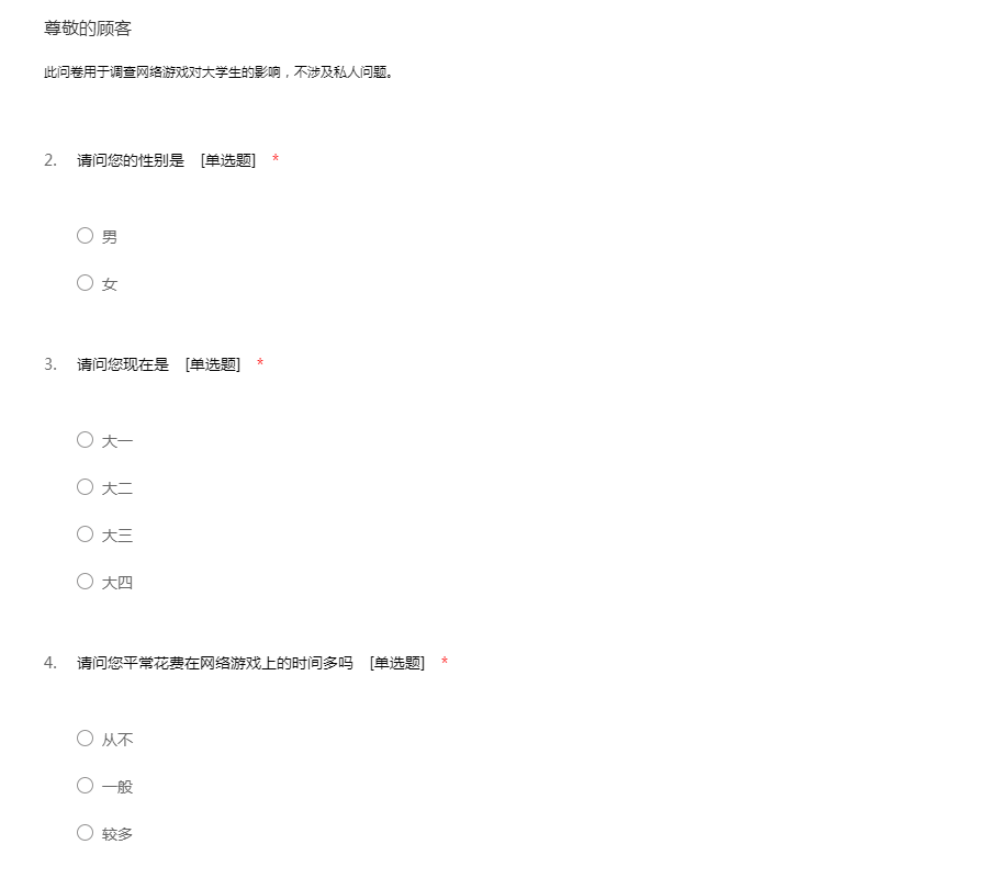 此问卷用于调查网络游戏对大学生的影响,不涉及私人问题。