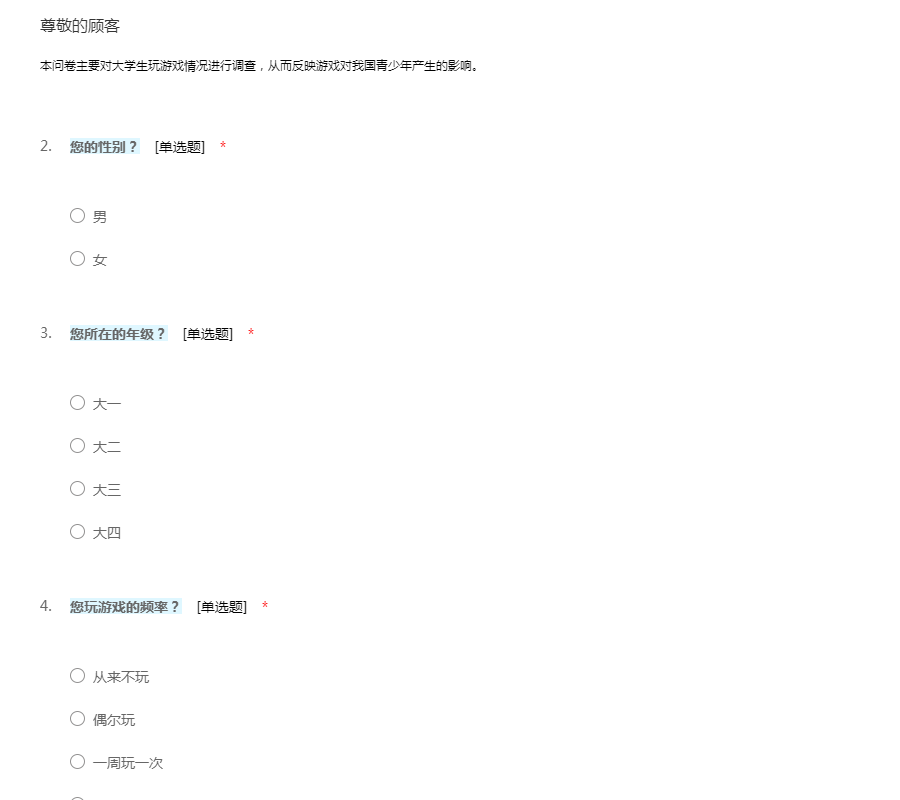 本问卷主要对大学生玩游戏情况进行调查,从而反映游戏对我国青少年产生的影响。