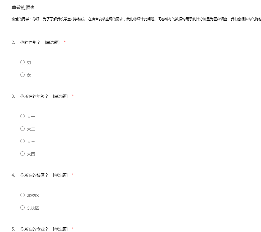 亲爱的同学:你好,为了了解我校学生对学校统一在宿舍安装空调的需求,我们特设计此问卷。问卷所有的数据均用于统计分析且为匿名调查,我们会保护你的隐私权,望能如实回答。在此感谢你的支持。