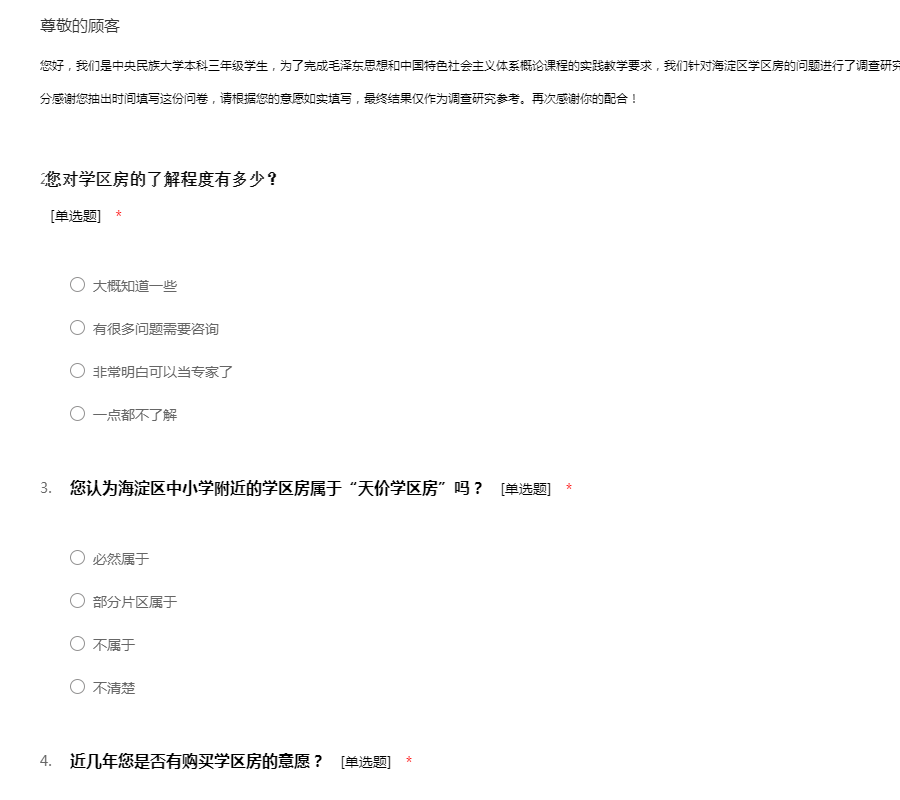 您好,我们是中央民族大学本科三年级学生,为了完成毛泽东思想和中国特色社会主义体系概论课程的实践教学要求,我们针对海淀区学区房的问题进行了调查研究,希望通过问卷调查了解您对学区房的看法。十分感谢您抽出时间填写这份问卷,请根据您的意愿如实填写,最终结果仅作为调查研究参考。再次感谢你的配合!