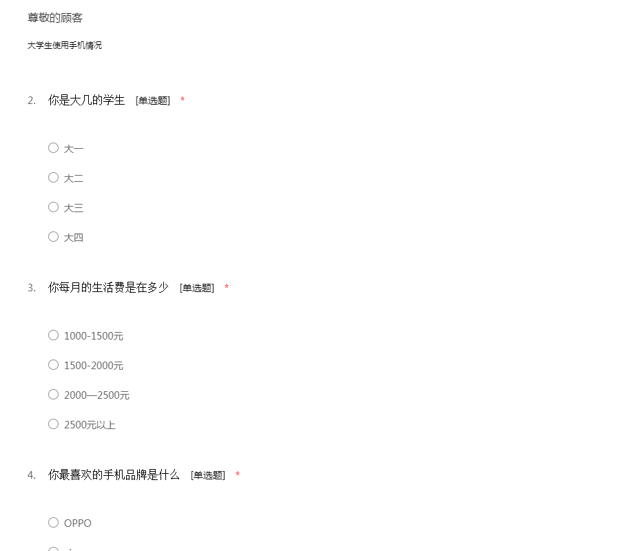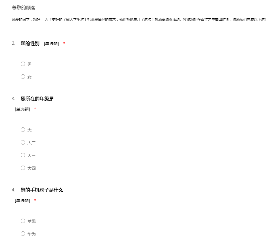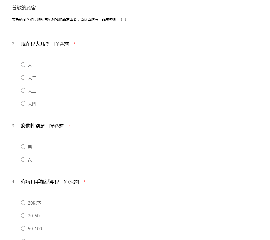 亲爱的同学,您好! 为了更好的了解大学生对手机消费情况的需求,我们特地展开了这次手机消费调查活动。希望您能在百忙之中抽出时间,协助我们完成以下这份调查问卷,谢谢合作!