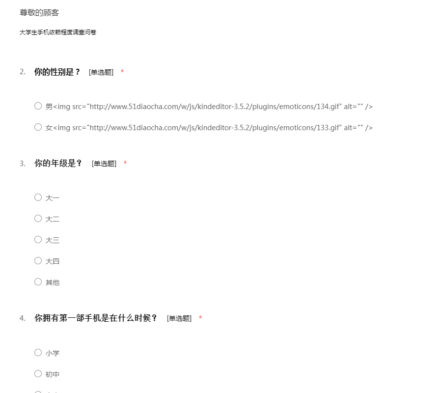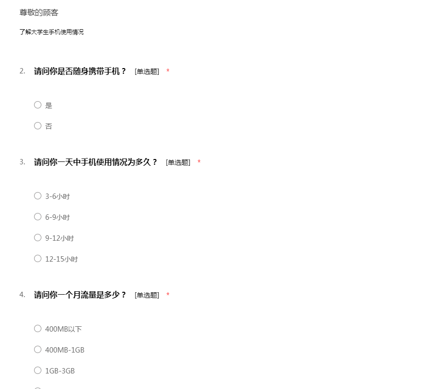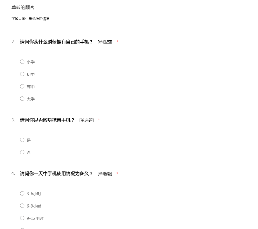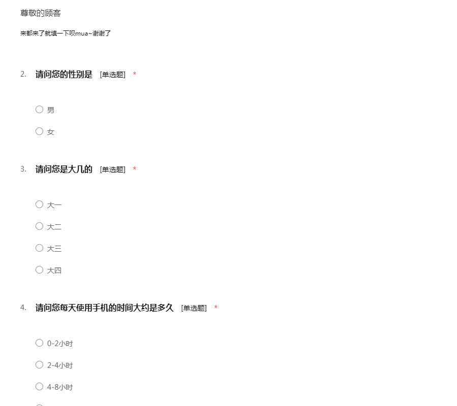 您好!我是一名在读大学生,我最近在进行一个关于大学生手机使用的调研活动,特向您征求相关意见及建议。此次问卷采取不记名形式,您的回答将完全保密;您的意见将成为此次调研的重要依据,期待收到您完整的答卷,谢谢!