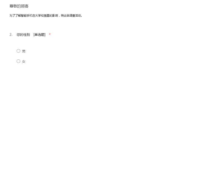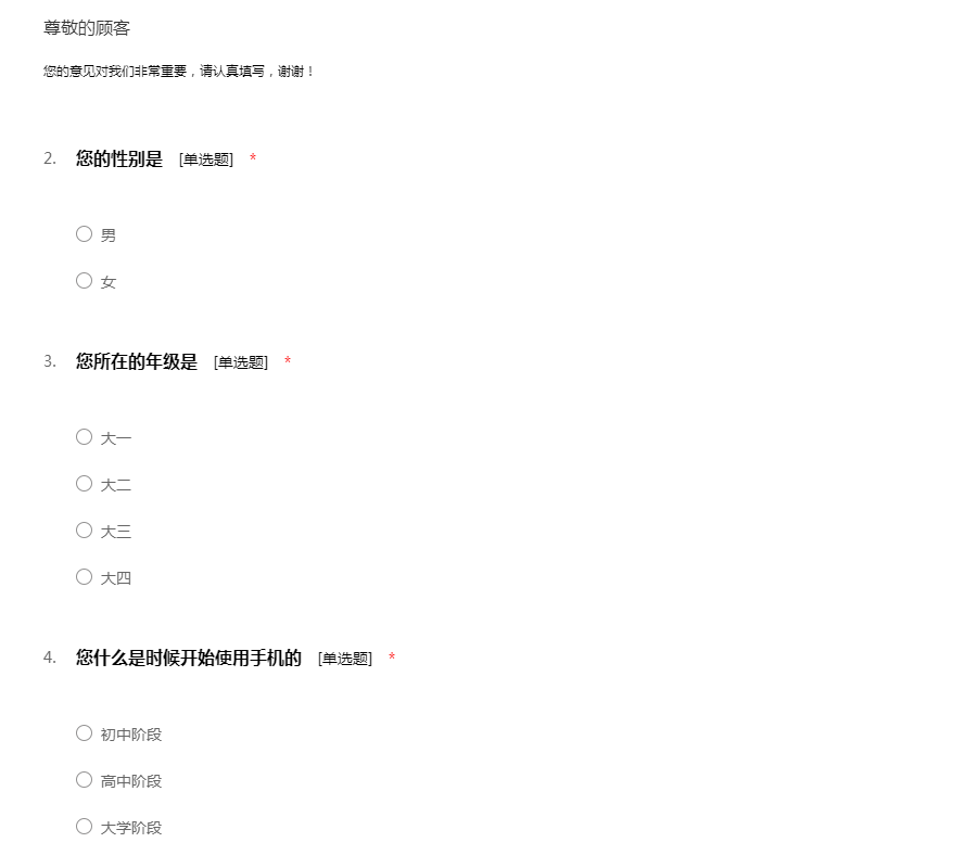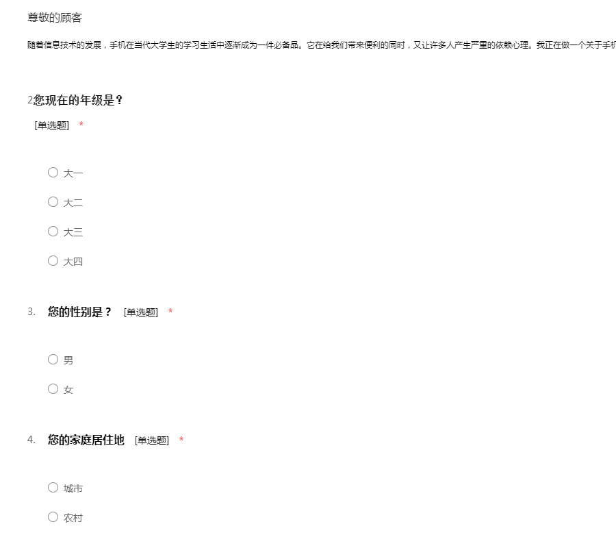您好!我是一名在读大学生,我最近在进行一个关于大学生手机使用的调研活动,特向您征求相关意见及建议。此次问卷采取不记名形式,您的回答将完全保密;您的意见将成为此次调研的重要依据,期待收到您完整的答卷,谢谢!