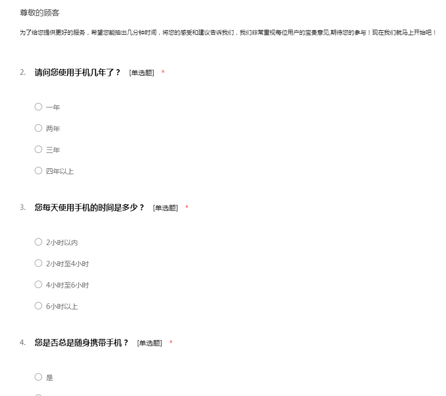 您好!为了更好的了解手机消费的需求我们特地展开了此次手机使用习惯调查活动。希望您在百忙之中抽出一点宝贵的时间协助我们完成以下这份调查问卷。谢谢您的合作!