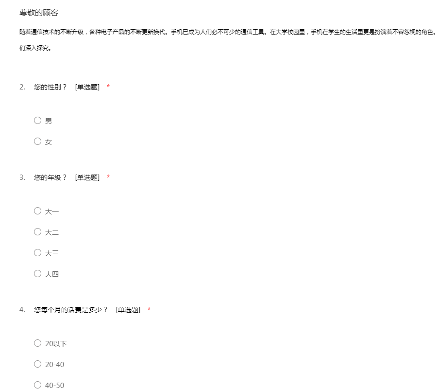 亲爱的同学们,为了更好了解您们对手机消费的需求,我们特地做了此次调查,希望您能帮助我们填以下这份调查问卷,我们感激不尽,谢谢!