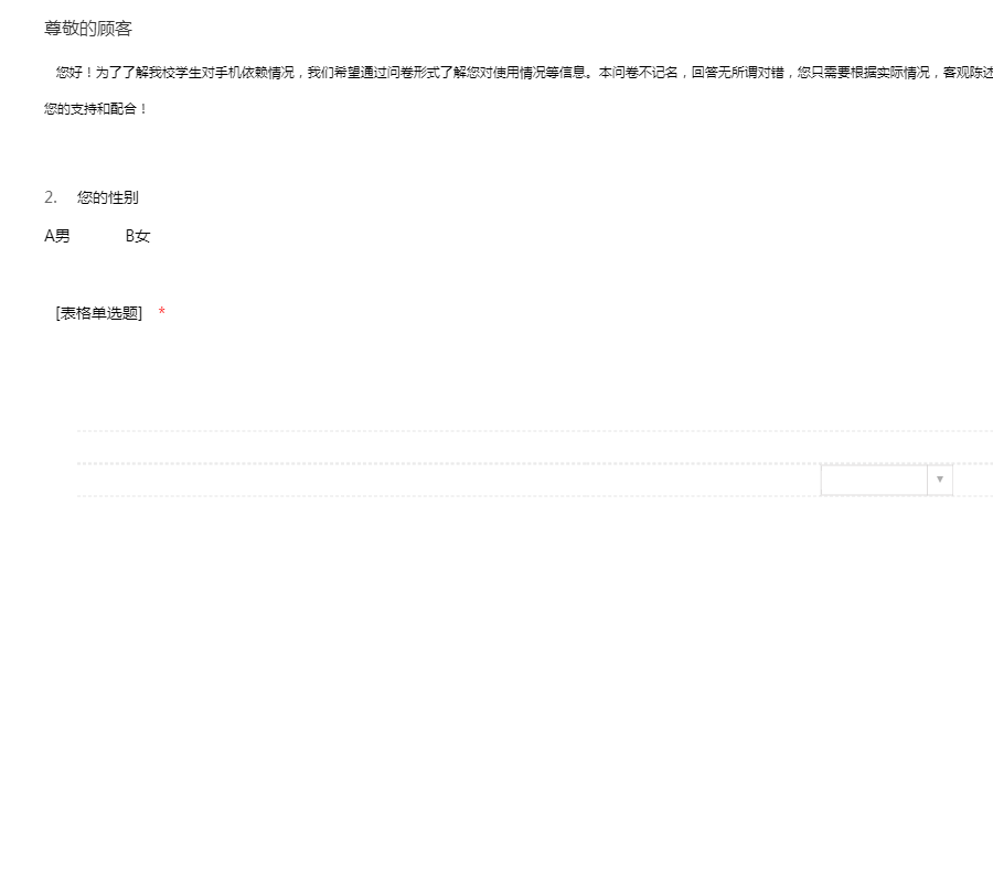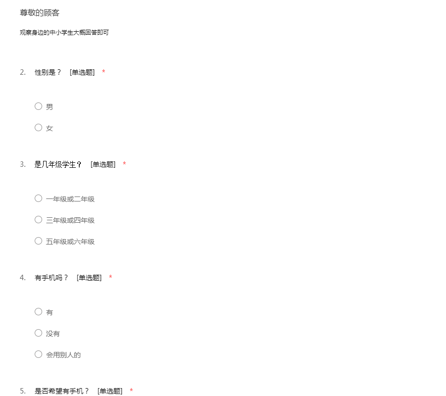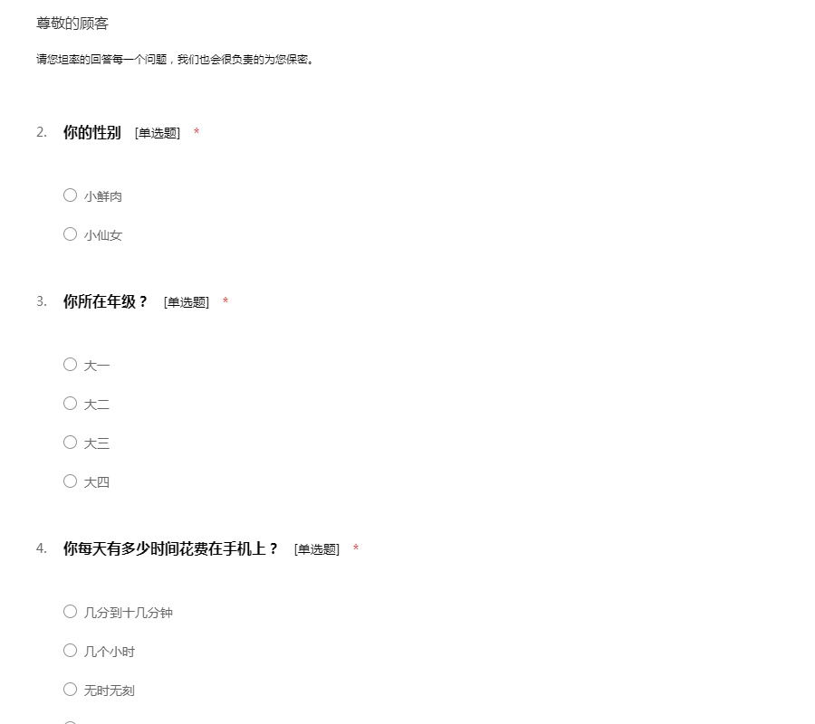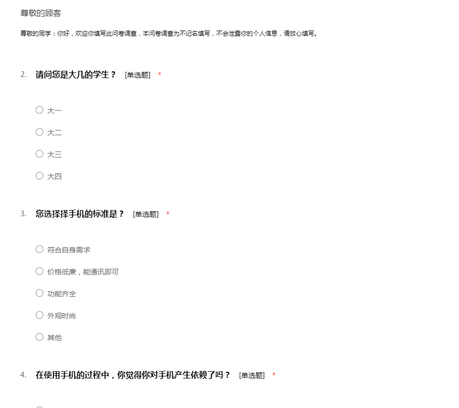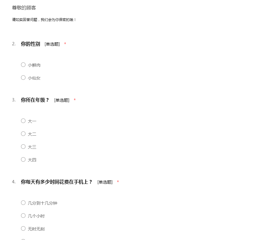 您好!我是一名在读大学生,我最近在进行一个关于大学生手机使用的调研活动,特向您征求相关意见及建议。此次问卷采取不记名形式,您的回答将完全保密;您的意见将成为此次调研的重要依据,期待收到您完整的答卷,谢谢!