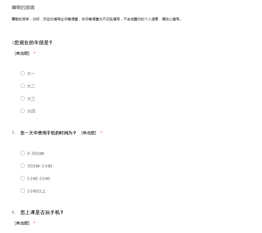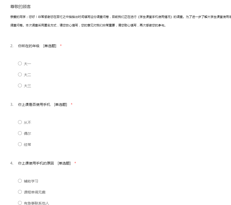 亲爱的同学;您好!非常感谢您在百忙之中抽抽出时间填写这份调查问卷,目前我们正在进行《学生课堂手机使用情况》的调查。为了进一步了解大学生课堂使用手机的原因,提高课堂教学质量,我们设计了本次调查问卷。本次调查采用匿名方式,请您放心填写,您的意见对我们非常重要,请您耐心填写,再次感谢您的参与。