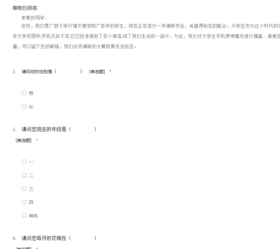 亲爱的同学:您好,我们是广西大学行健文理学院广告学的学生,现在正在进行一项调研作业,希望得到您的配合。大学生作为这个时代的先进代表,是手机消费群体的重要部分,在大学校园中,手机无处不在,它已经渗透到了各个角落,成了我们生活的一部分。为此,我们对大学生手机使用情况进行调查,谢谢您的参与。若您对本次调研的结果感兴趣,可以留下您的邮箱,我们会将调研的大概结果发送给您。