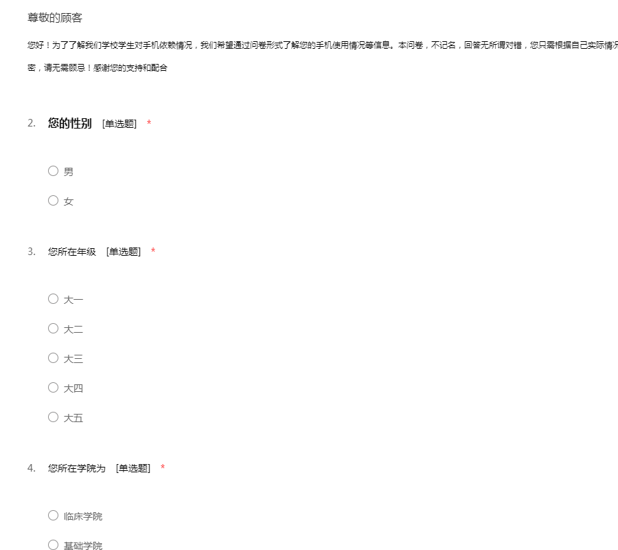 您好!为了了解我们学校学生对手机依赖情况,我们希望通过问卷形式了解您的手机使用情况等信息。本问卷,不记名,回答无所谓对错,您只需根据自己实际情况,客观陈述观点即可,我们将您的回答严格保密,请无需顾忌!感谢您的支持和配合