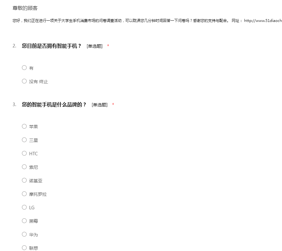 您好,我们正在进行一项关于大学生手机消费市场的问卷调查活动,可以耽误您几分钟时间回答一下问卷吗?感谢您的支持与配合。 网址: http://www.51diaocha.com