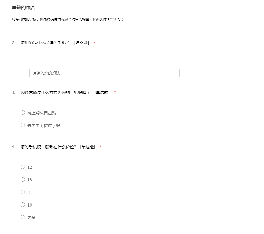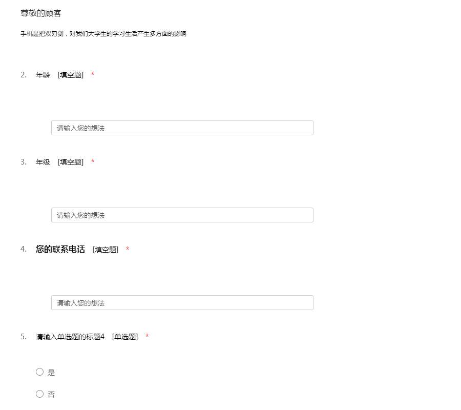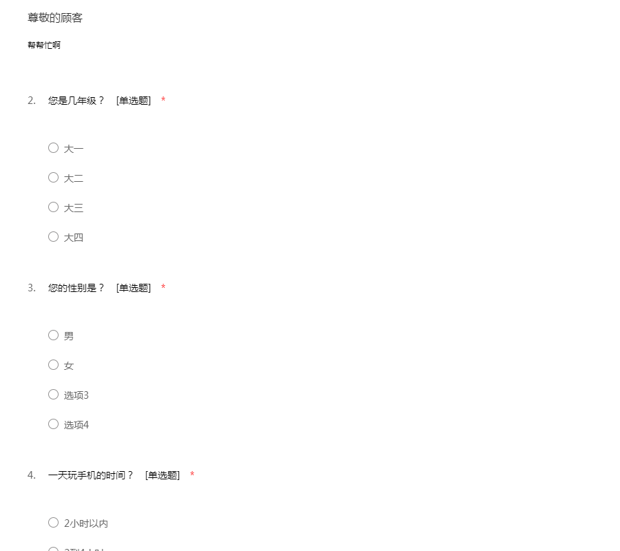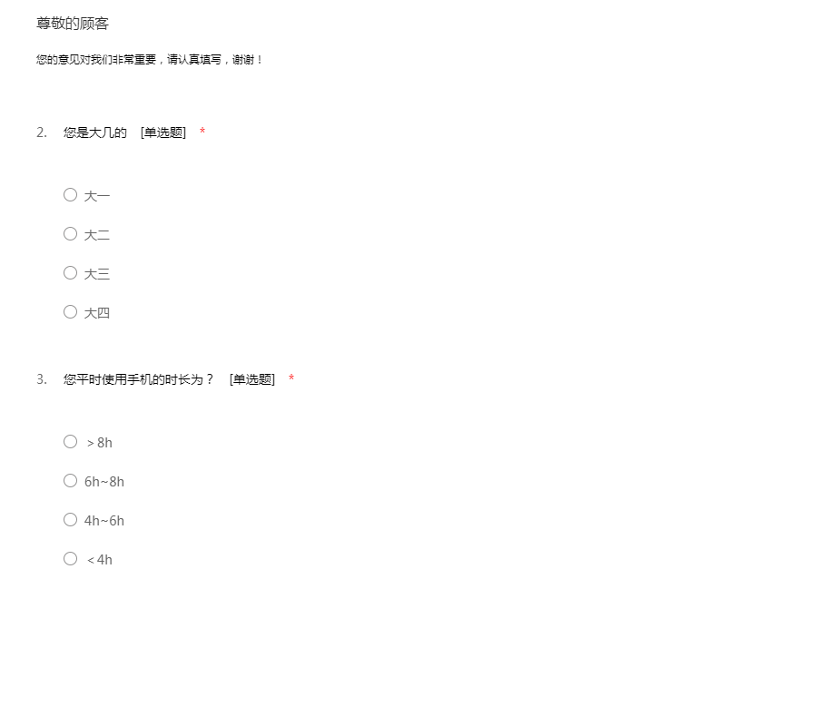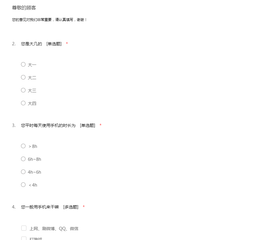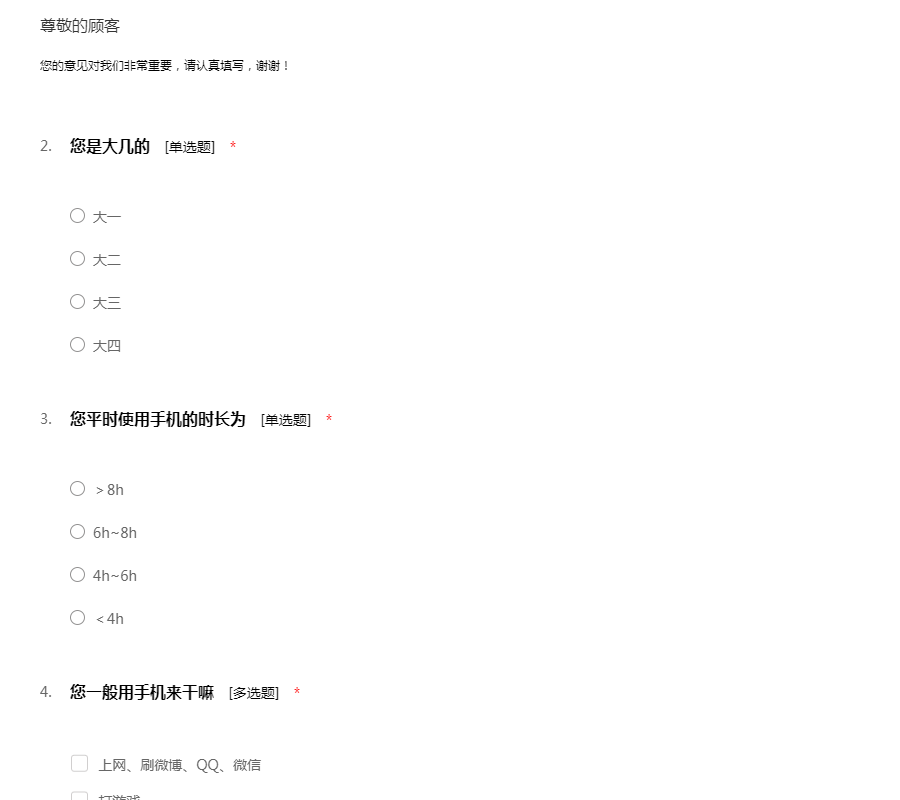 您好!我是一名在读大学生,我最近在进行一个关于大学生手机使用的调研活动,特向您征求相关意见及建议。此次问卷采取不记名形式,您的回答将完全保密;您的意见将成为此次调研的重要依据,期待收到您完整的答卷,谢谢!