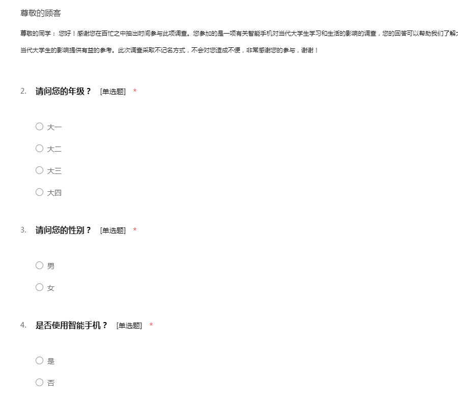 尊敬的同学: 您好!感谢您在百忙之中抽出时间参与此项调查。您参加的是一项有关智能手机对当代大学生学习和生活的影响的调查,您的回答可以帮助我们了解大学生的生活状态,为我们探讨分析智能手机对当代大学生的影响提供有益的参考。此次调查采取不记名方式,不会对您造成不便,非常感谢您的参与,谢谢!
