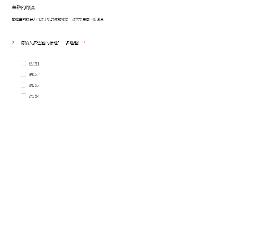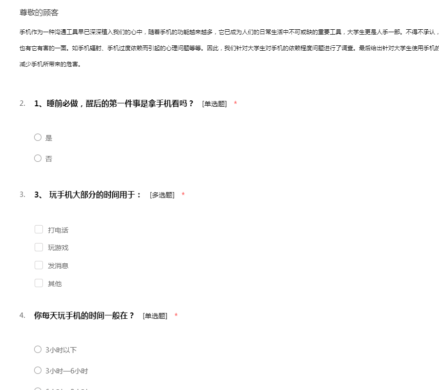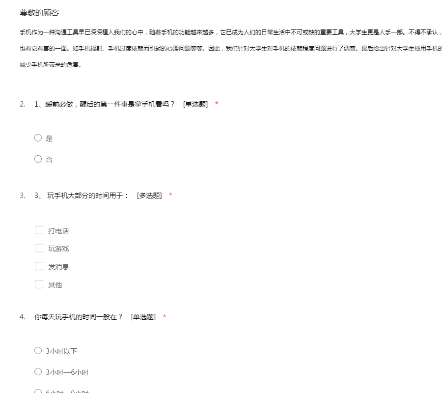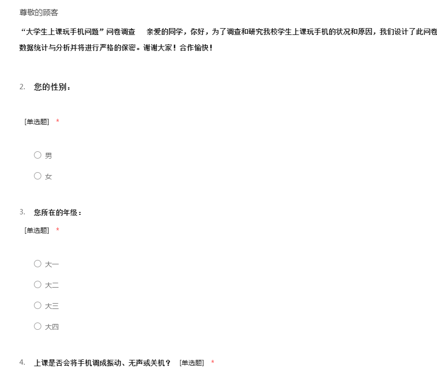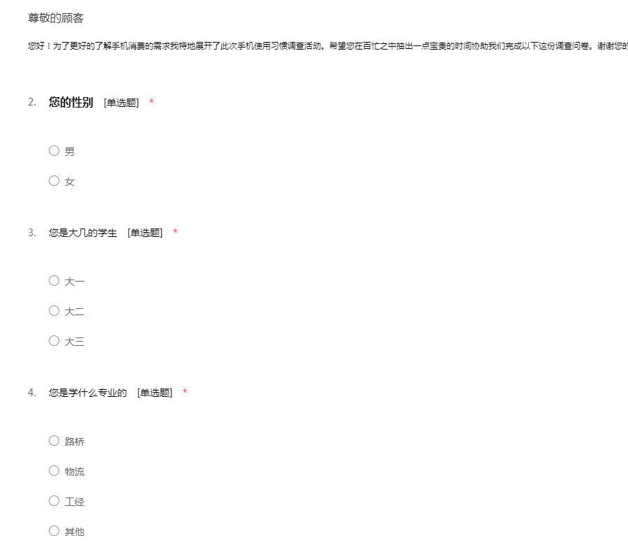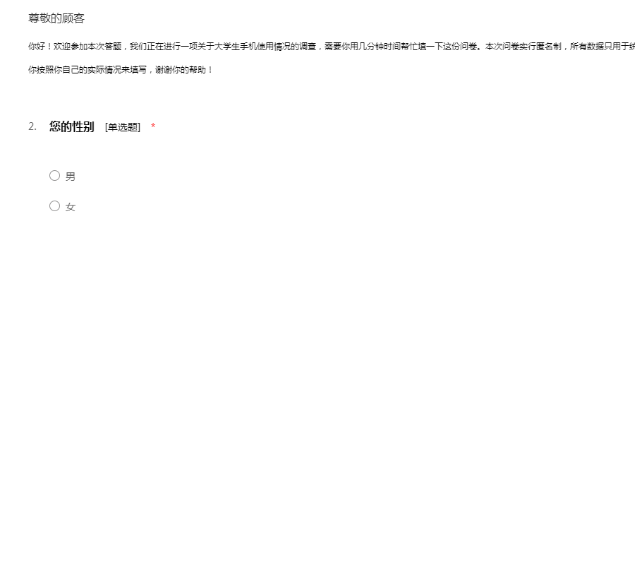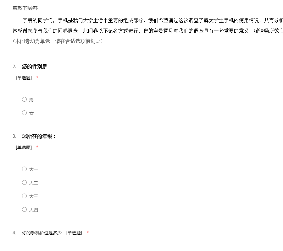 您好!我是一名在读大学生,我最近在进行一个关于大学生手机使用的调研活动,特向您征求相关意见及建议。此次问卷采取不记名形式,您的回答将完全保密;您的意见将成为此次调研的重要依据,期待收到您完整的答卷,谢谢!