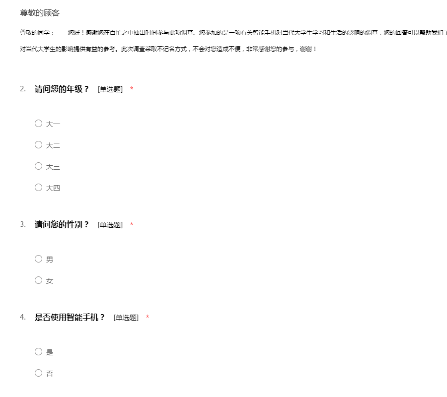 尊敬的同学: 您好!感谢您在百忙之中抽出时间参与此项调查。您参加的是一项有关智能手机对当代大学生学习和生活的影响的调查,您的回答可以帮助我们了解大学生的生活状态,为我们探讨分析智能手机对当代大学生的影响提供有益的参考。此次调查采取不记名方式,不会对您造成不便,非常感谢您的参与,谢谢!