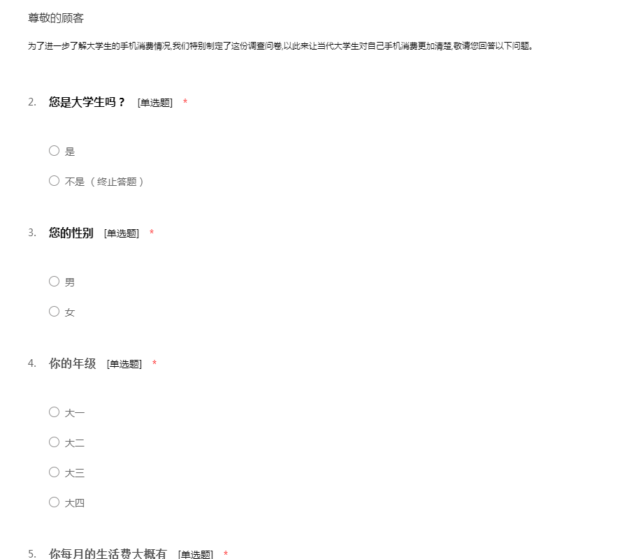 为了进一步了解大学生的手机消费情况,我们特别制定了这份调查问卷,以此来让当代大学生对自己手机消费更加清楚,敬请您回答以下问题。